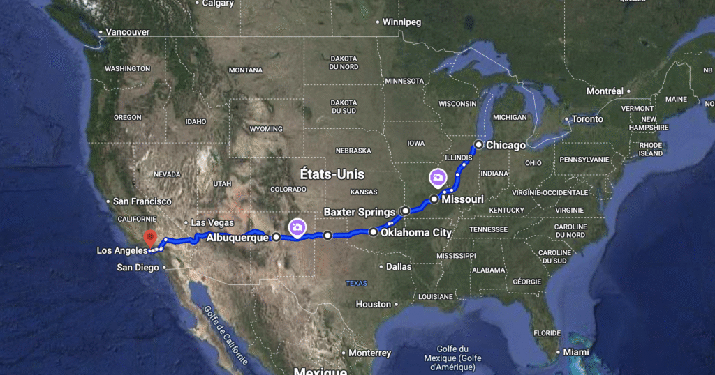 Son point de départ est Chicago et son point d’arrivée est Santa Monica, à Los Angeles.
